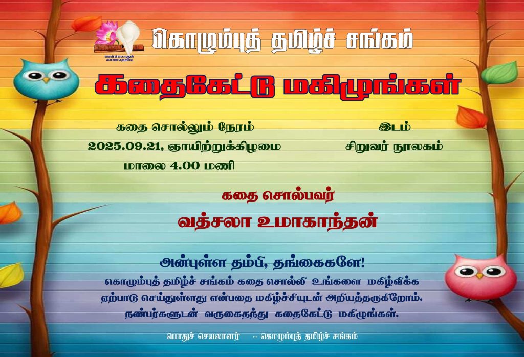 நிகழ்வு 2025.09.21 ஆம் திகதி ஞாயிற்றுக்கிழமை மாலை 4.00 மணிக்கு கொழும்புத் தமிழ்ச் சங்க நூலகத்தின் சிறுவர் பகுதியில் நடைபெறவுள்ளது.