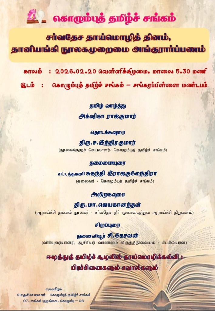 2026.02.20ம் திகதி வெள்ளிக்கிழமை மாலை 5.30 மணிக்கு சங்கரப்பிள்ளை மண்டபத்தில் நடைபெறும்.