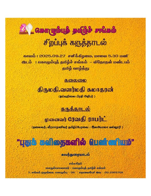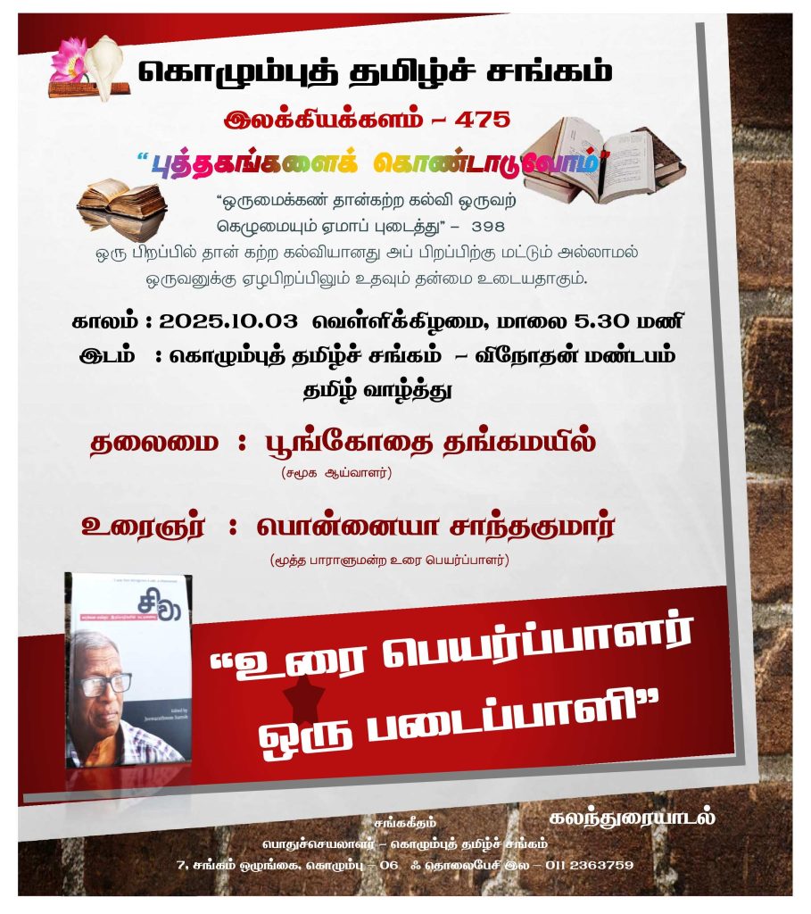 நிகழ்வு 2025.10.19 ஆம் திகதி ஞாயிற்றுக்கிழமை மாலை 4.00 மணிக்கு கொழும்புத் தமிழ்ச் சங்க நூலகத்தின் சிறுவர் பகுதியில் நடைபெறவுள்ளது.