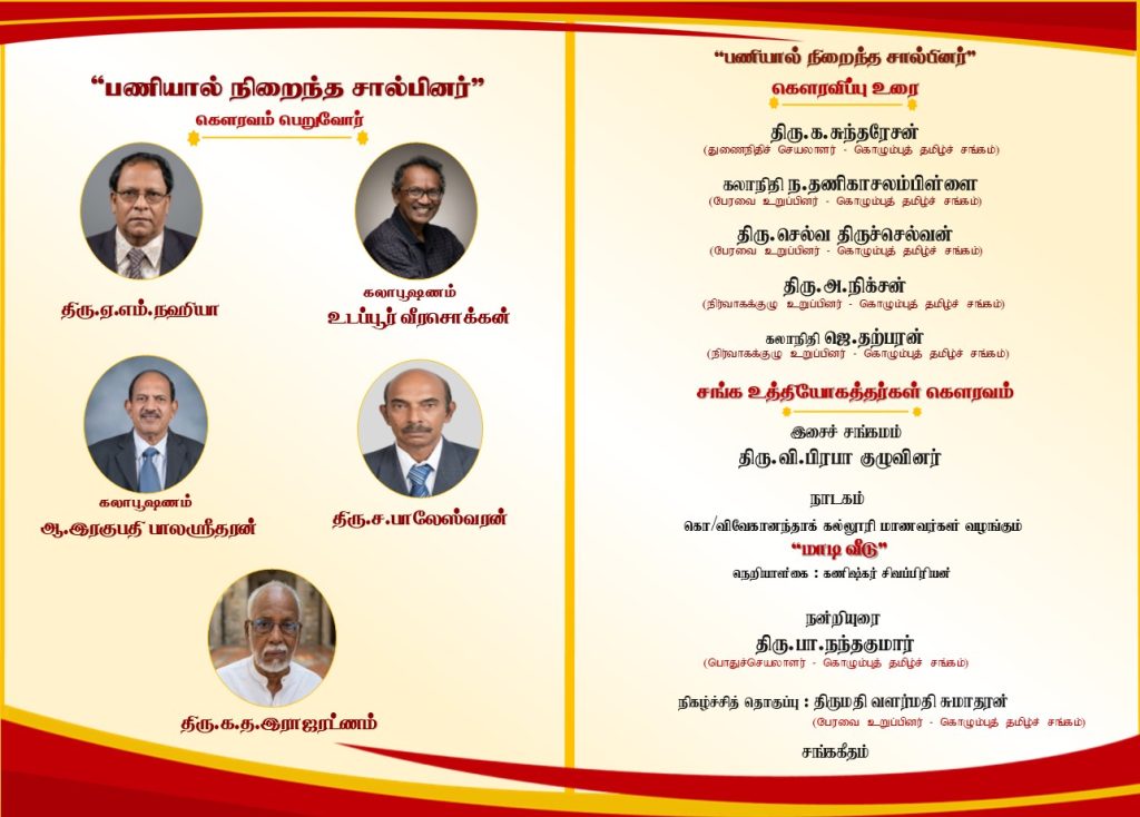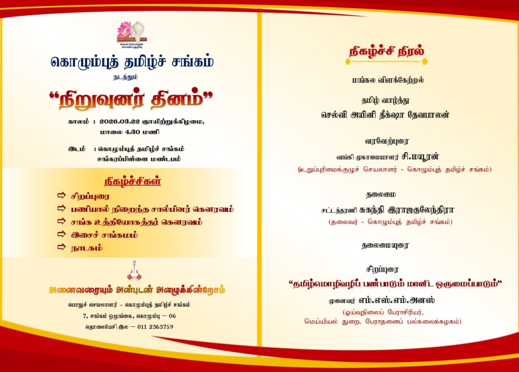 2026.03.08 ஞாயிற்றுக்கிழமை, காலை 9.30 மணி, மாலை 4.30 மணி கொழும்புத் தமிழ்ச் சங்கம் சங்கரப்பிள்ளை மண்டபத்தில் நடைபெறும்.